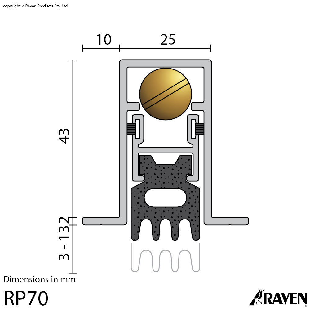 A heavy duty, fully morticed, automatic door bottom seal that is spring loaded to lift clear of the floor when the door is opened. It is self levelling and reversible for left and right handed operation. Acoustically designed, featuring an EPDM foam gasket for acoustic door applications. RP70 is operated automatically by pressure against the door jamb on its adjustable brass strike.