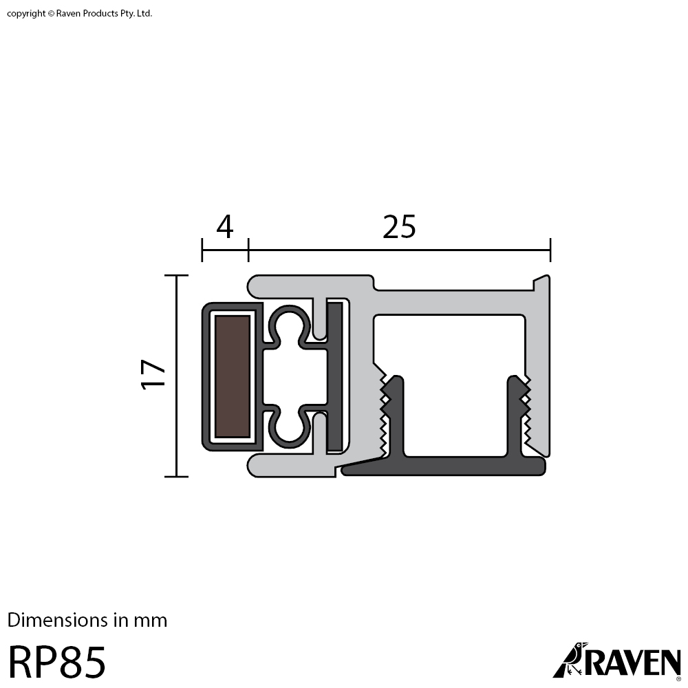 A refrigeration type vinyl magnetic strip in an anodised aluminium housing with concealed fixings. RP85 provides a tight seal for steel clad doors and jambs and may be used as a stop. For timber doors, a thin steel strip can be attached to the door face. The magnetic strip has sufficient closing strength that latches may not be required.